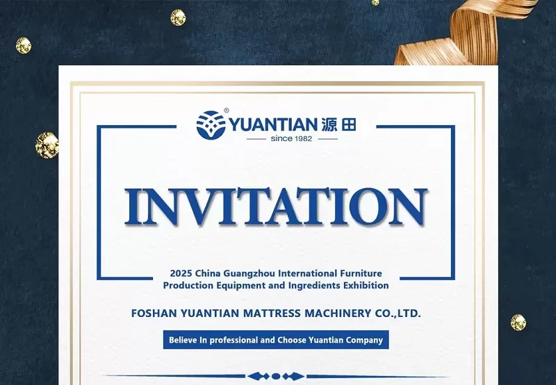 2025/03/26Foshan Yuantian Mattress Machinery Co., Ltd. cordially invites you to meet at the 55th China (Guangzhou) International Furniture Fair!�� Hall: S13.1-C01⏰ Date: March 28-31 Witness the grand debut of our upgraded intelligent mattress manufacturing equipment. Industry peers are sincerely invited to explore manufacturing innovation together!Anticipate on-site discussions about future trends in mattress machinery! ��#YuantianMattressMachinery #MattressManufacturingEquipment #ProductionLineSolutions #GuangzhouFurnitureFair #IntelligentManufacturing #IndustryTrendsetter #SeeYouThere