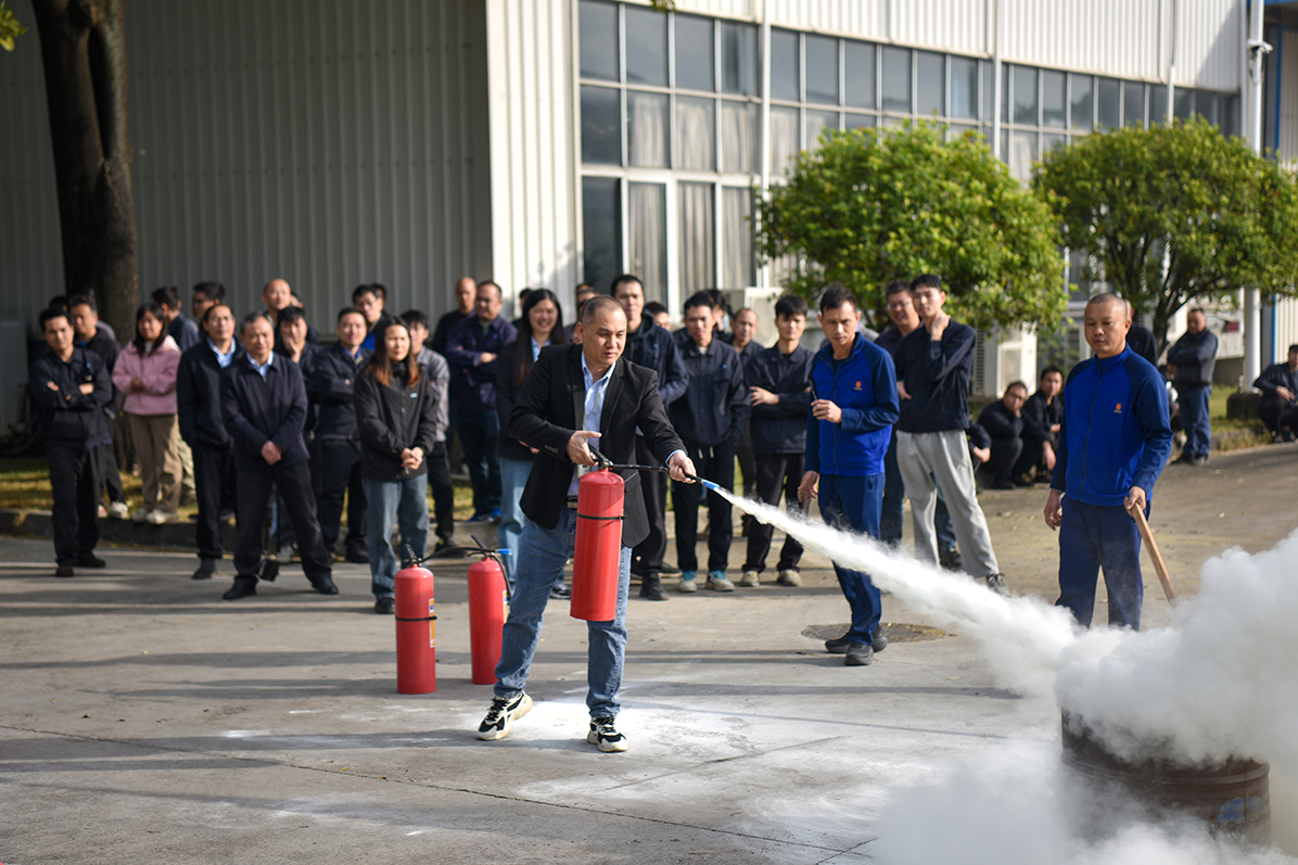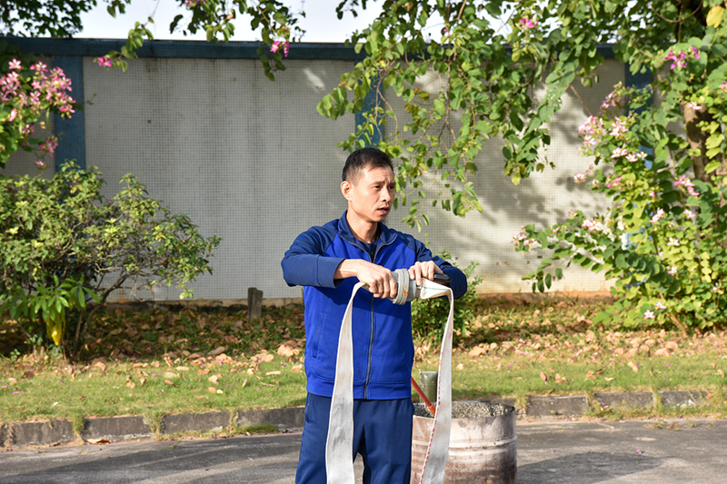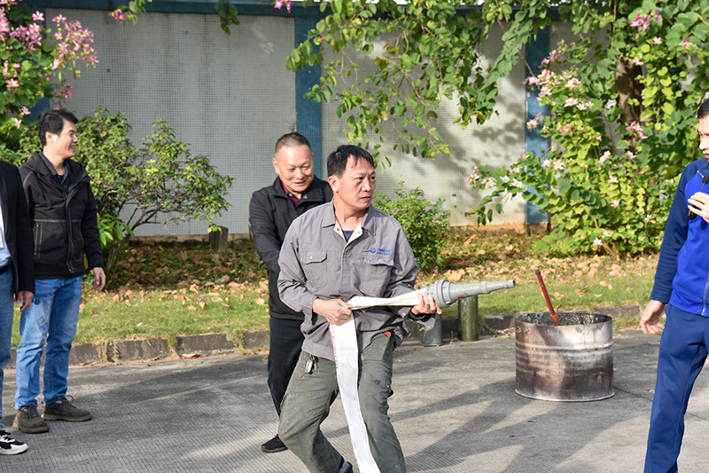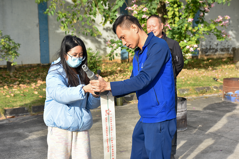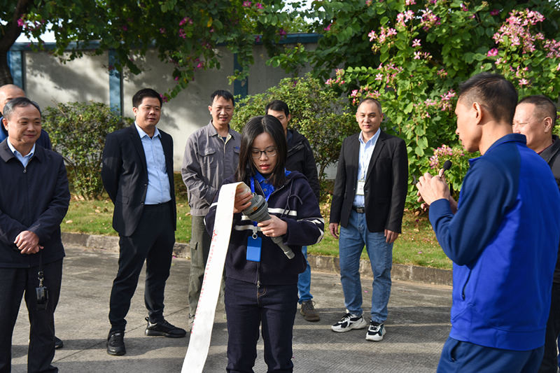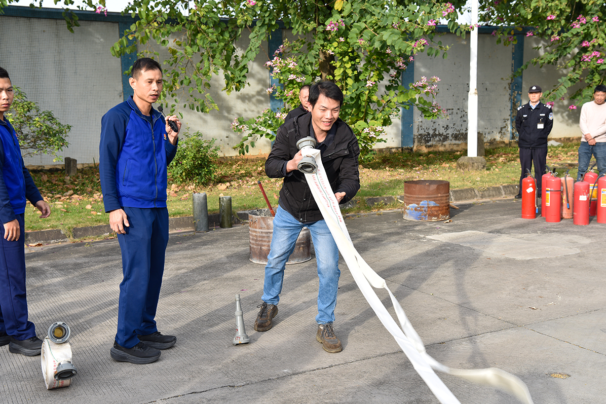 Following the theoretical presentation, practical training commenced, the most anticipated part for employees. Liu Ruwei, deputy captain of the Lishui Town Fire Brigade, and his team demonstrated hands-on operations. The use of fire hoses follows a three-step method: first, lay the hose flat to avoid twists and knots; second, align the connectors with the hydrant and nozzle, tightening clockwise to ensure a seal; finally, slowly open the valve and adjust the water pressure according to the fire situation.