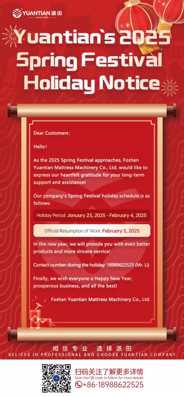 As the 2025 Spring Festival approaches, Foshan Yuantian Mattress Machinery Co., Ltd. would like to express our heartfelt gratitude for your long-term support and assistance!